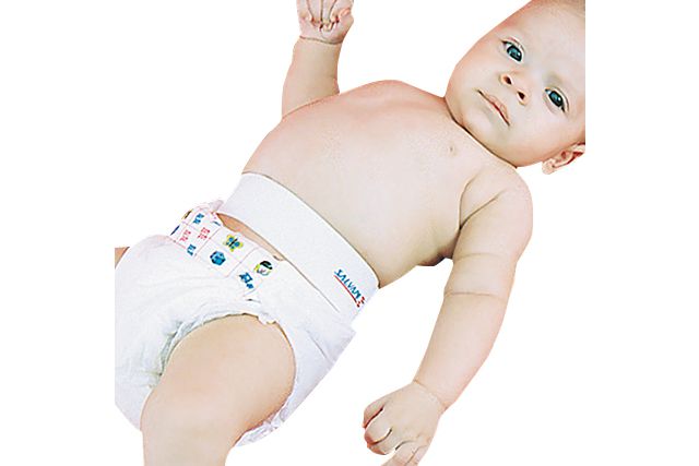 Elástico reforçado. Almofada umbilical de microespuma. Fecho aderente. Lavável.